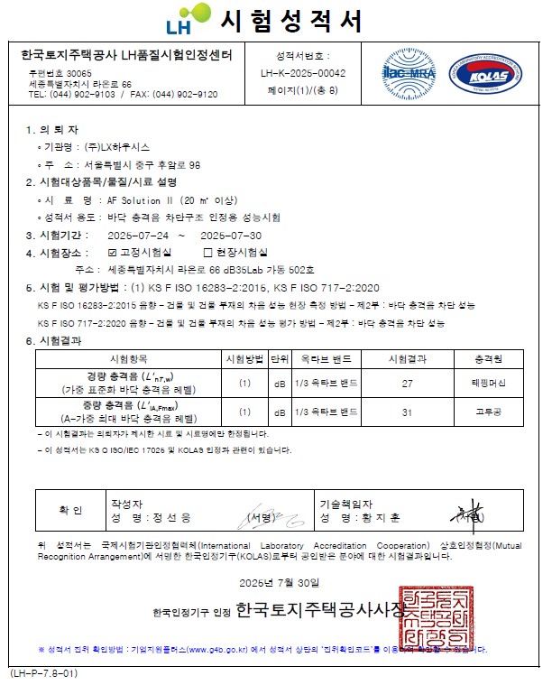 ■ LH품질시험인정센터 바닥충격음 품질시험서 중량·경량 충격음 각각 31dB·27dB 기록, 모두 1등급 인정서 확보